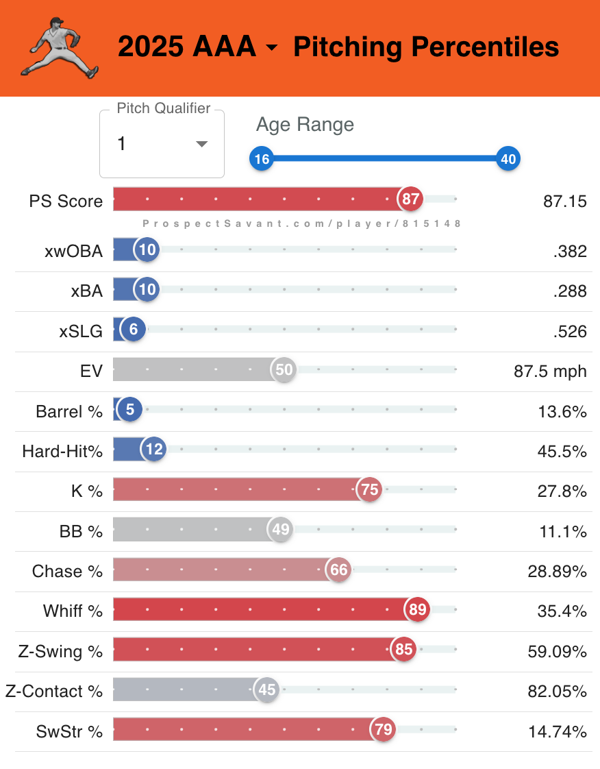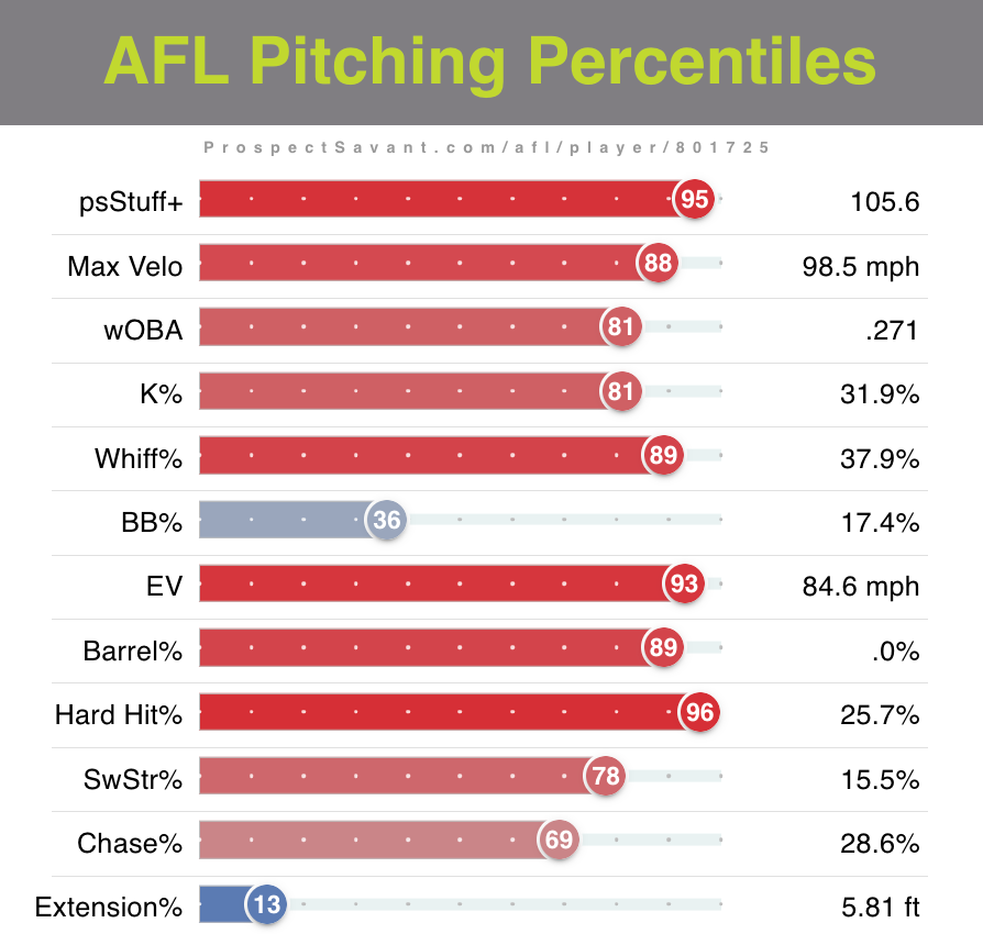Signed as an amateur out of the Dominican in 2021 for a mere $30,000, De León has been a developmental success story for the Orioles, improving the command of his 70-grade fastball in 2025 as his slider and changeup became more effective as well. The 22-year-old finished strong at Hi-A, dominated in 3 starts after a promotion to AA Chesapeake and continued to impress in the Arizona Fall League. Just take a look at the AFL pitching percentiles below.