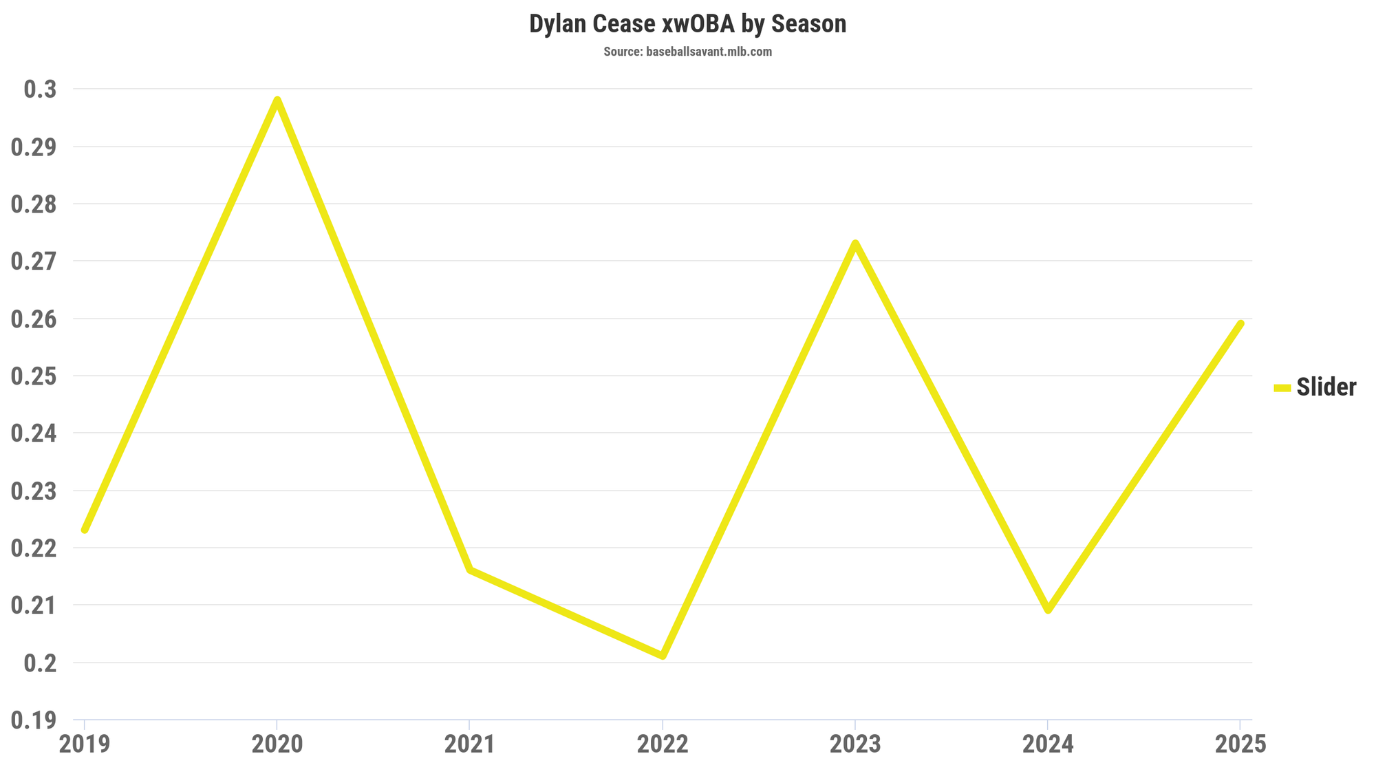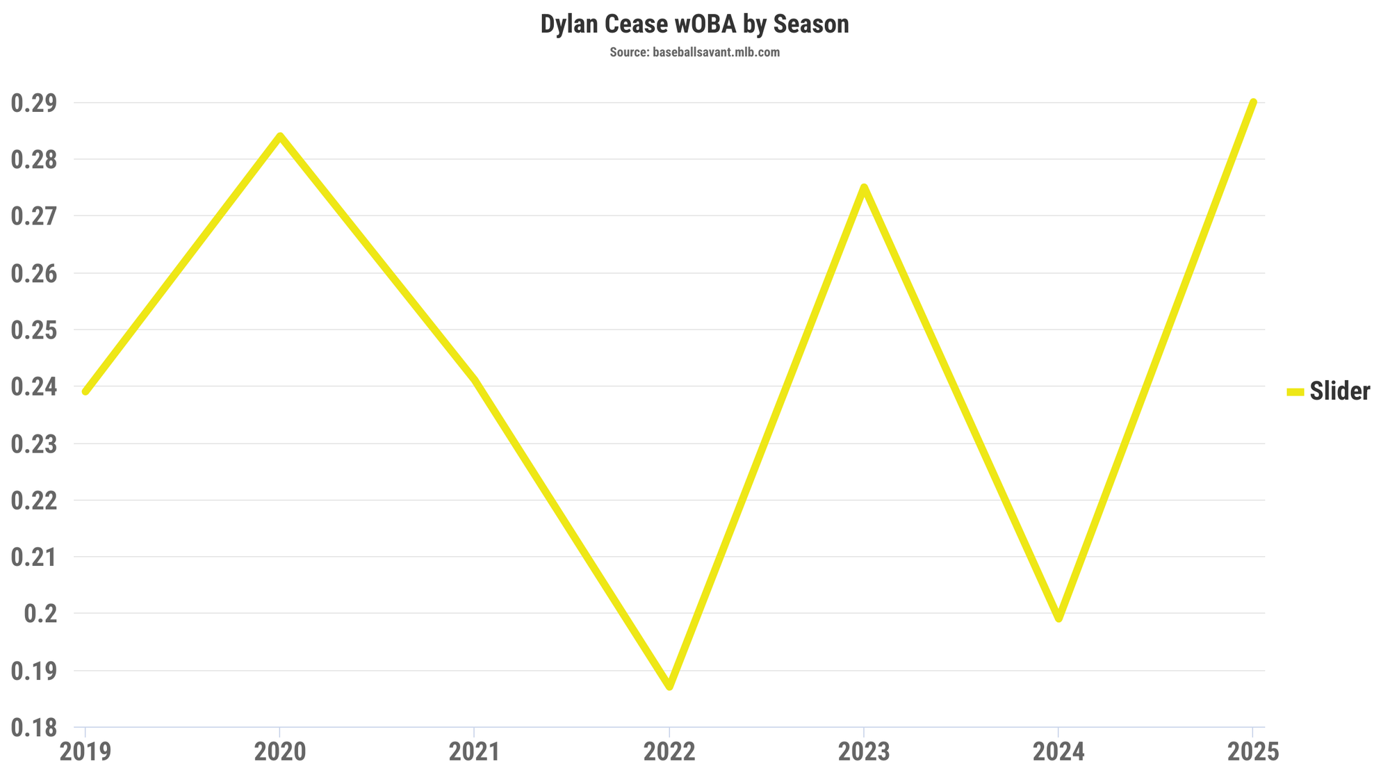 Cease is predominantly a 2-pitch pitcher, relying on his fastball and slider 80 to 85% of the time. This is fine when, as in 2022, his slider has an elite 125 Stuff+ grade with good command. But in the two years that Cease has seen an inflated ERA, his slider Stuff+ grade has dipped down to a just "very good" 115. The pitch remained an excellent whiff generator, with a swing and miss rate consistently around 43%, but when hitters did make contact, they hit it much harder in '23 and '25.
