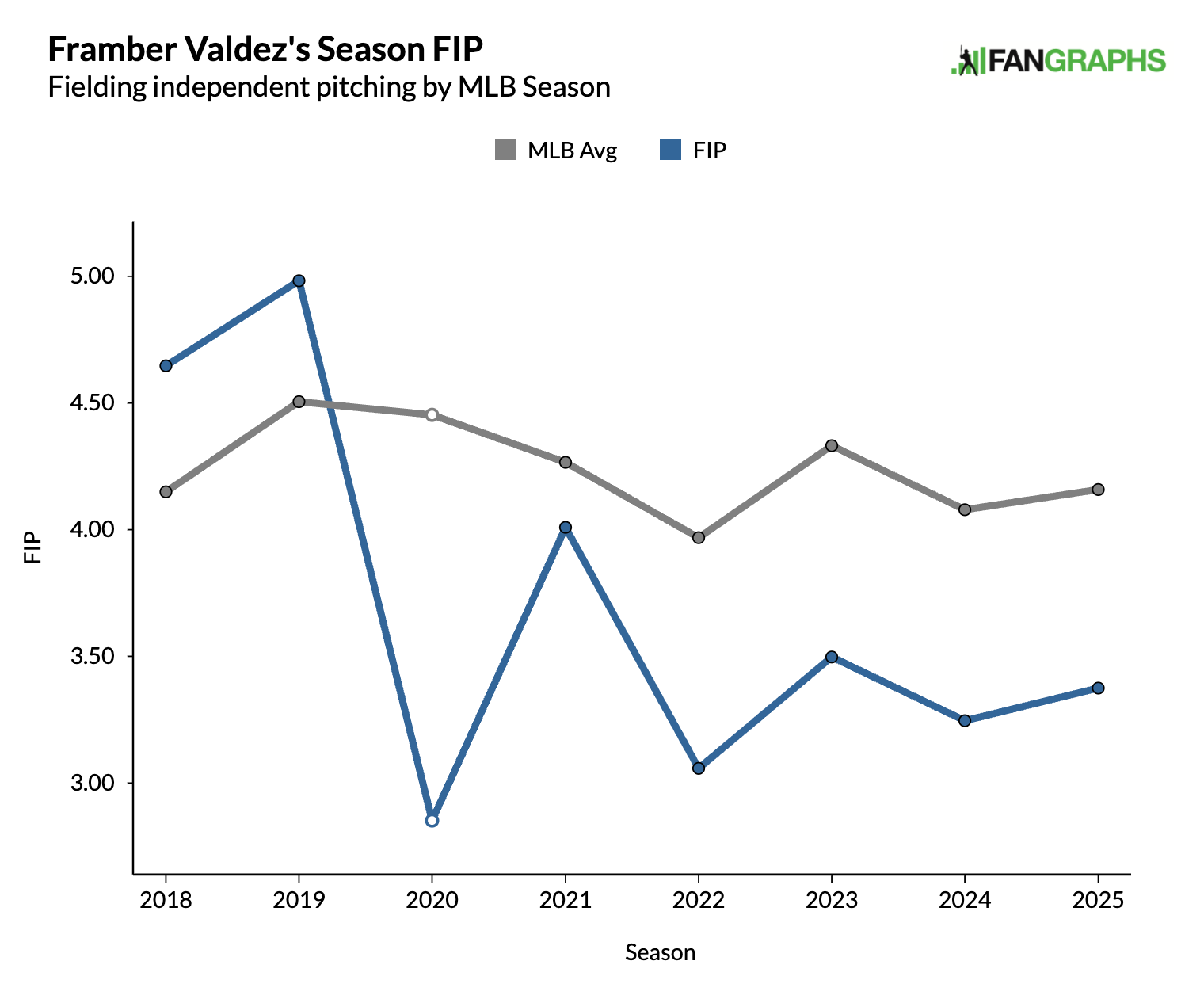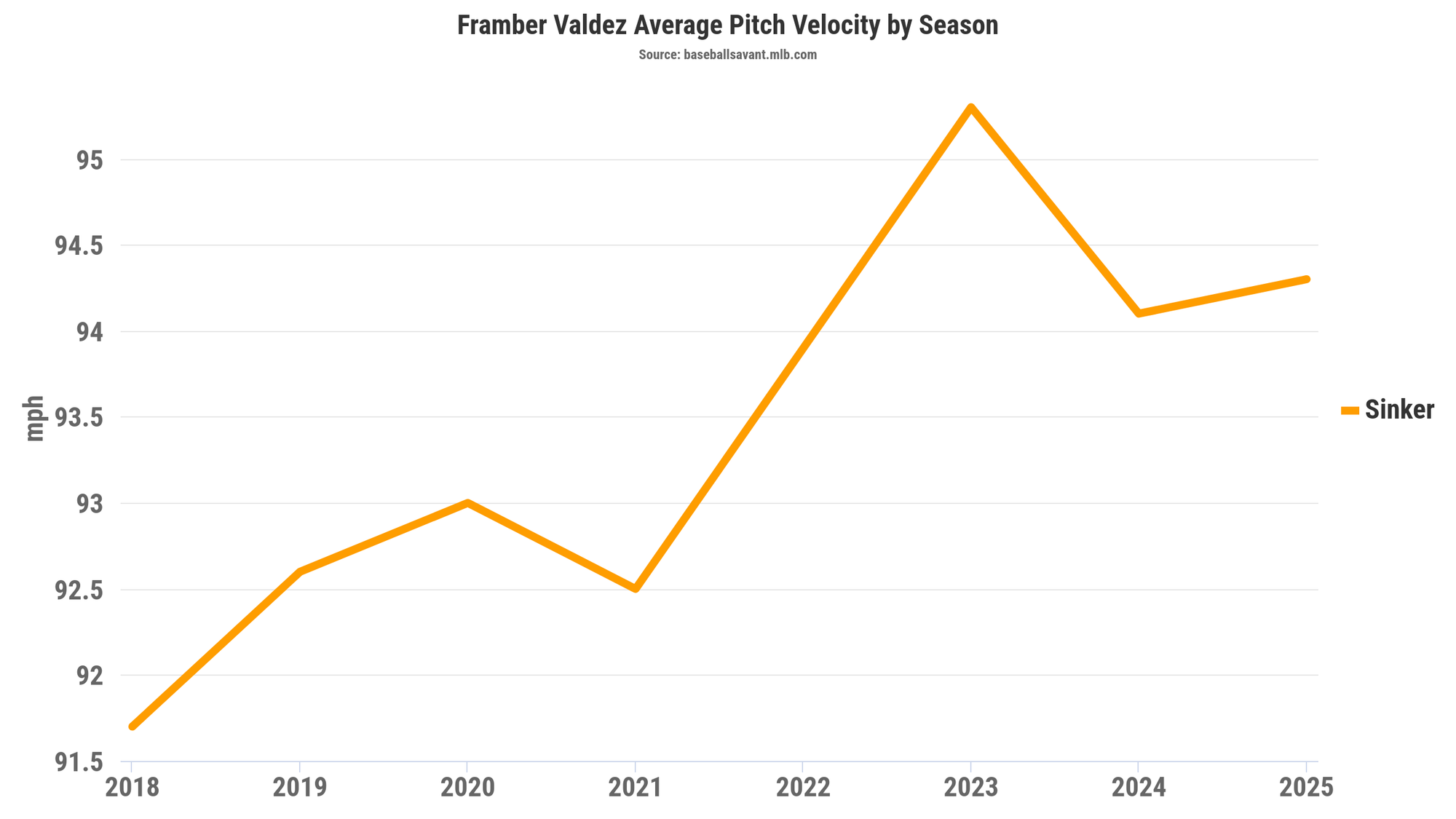 By the time Valdez finished his first cup of coffee in the big leagues, in 2018, Elias was on his way out to take over as general manager of the Orioles. Rosenbaum would follow a year later, joining the front office as Director of Baseball Development. Valdez had a mini-breakout in the shortened Covid year that followed, but it wouldn't be until 2022 that he would have his first truly "Framber" year: 200+ innings with a sub-3 ERA and 4.4 fWAR. It was the first in a four-year run in which Framber ranked second in MLB in innings pitched and 19th among qualified starters in ERA, leaving him 5th in overall fWAR.