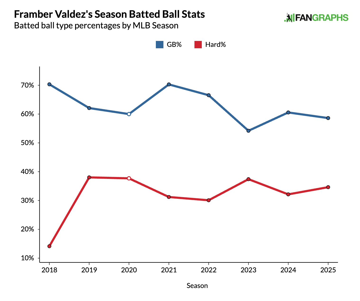 There are some reasons for optimism, though. Framber is starting with a high stuff baseline of 106 Stuff+ since 2020 and 108 in 2025. Even though he doesn't strike out a ton of batters, his velocity is holding strong at 95-96, harder than he was throwing earlier in his career. Even though I'd expect clear decline as he enters and surpasses his mid-30s, he could still be reasonably effective toward the back of that contract. And while his locations aren't great, his fastball shape allows him to avoid barrels even on hard contact, while his curve is a legitimate whiff pitch. Add in a changeup that is effective against righties and the overall picture is a guy who is somewhere between "good enough" and "great" and just about everything that correlates with success.